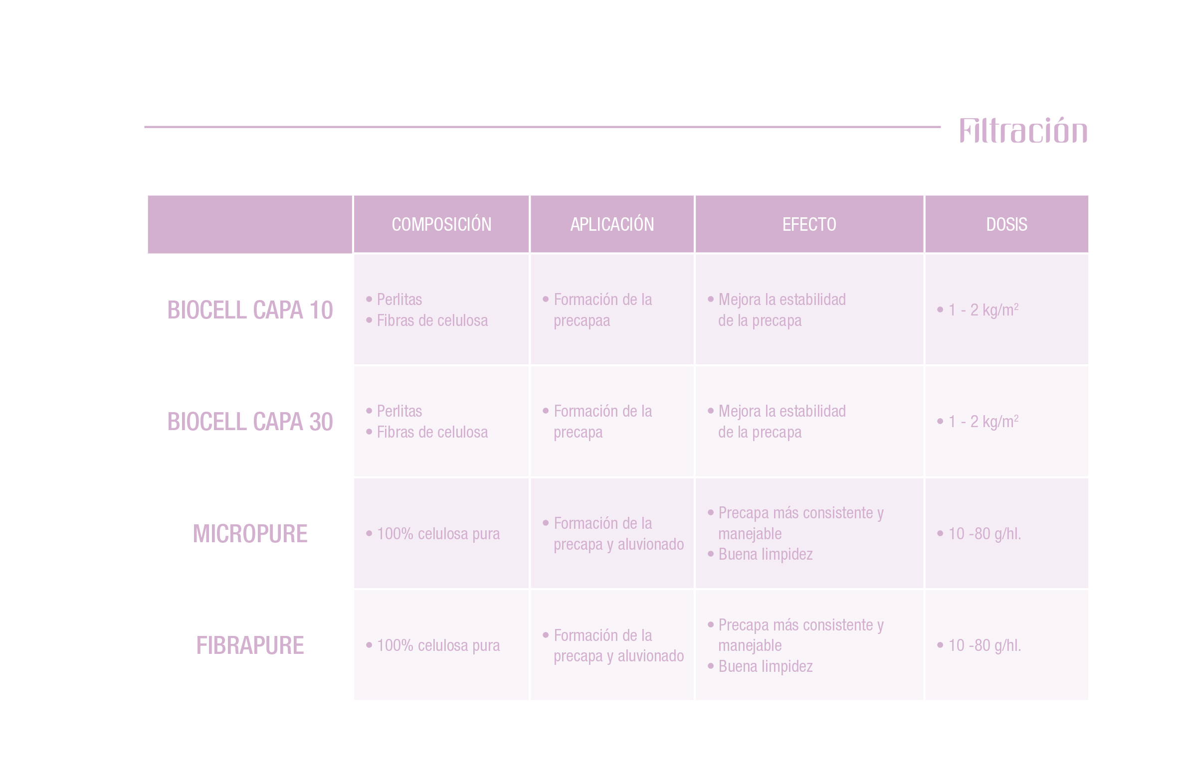 Biocell Capa 10 y Biocell Capa 30 son una gama de coadyuvantes de filtración en la realización de la precapa, antes del inicio de la filtración, mejorando la formación de la misma.